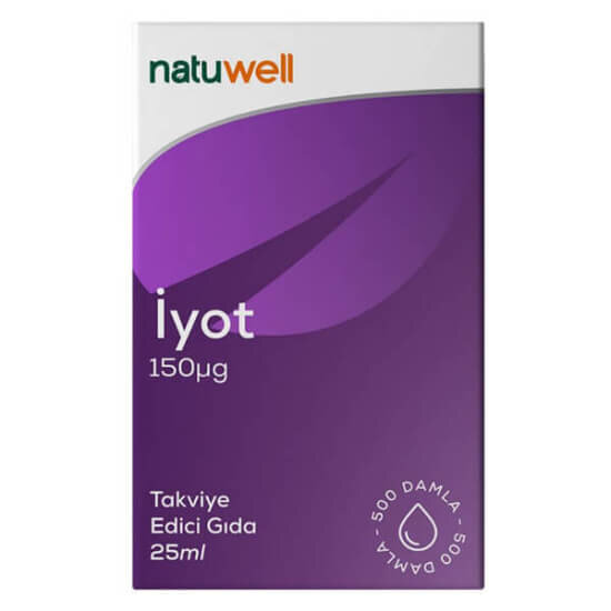 Natuwell İyot Damla 25 ml Etken Madde 1 Damla İyot 150 mcg Ürün Bileşimi: Su, potasyum iyodür, iyot ve asitlik düzenleyici: sitrik asit (E 330) Kullanım Bilgisi: Günde 1 defa 1 damla kullanılması tavsiye edilir. 11 yaş ve üzeri bireylerin kullanımına yöneliktir.