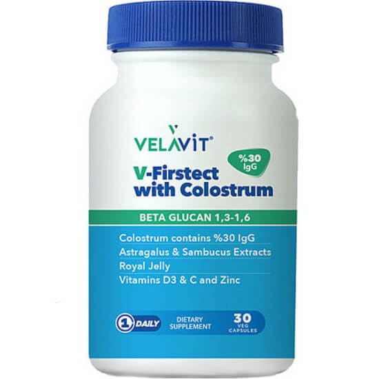 Velavit V Firstect With Colostrum, tablet formunda satışa sunulan, kendine has formülü ile öne çıkan bir takviye edici gıda. Markanın resmi sayfasındaki beyanına göre; içeriğindeki standardize %30 IgG’li kolostrum’la beta glukan ve D3 Vitaminini bir araya getiren Türkiye’deki tek ürün olan Velavit Colostrum arı sütü desteğine de sahip. 8 özel bileşeni sayesinde her kapsülünde % 30 IgG içeren kolostrum, 100 mg beta glukan 1,3-1,6, 10 mg arı sütü desteği, çinko, C Vitamini ve D3 Vitamini içeren bu takviyeler astragalus ve sambucus bitkileri ile de zenginleştirilmiş bir formül sunuyor. Bağışıklık sistemine yönelik özel takviyeler arasında yer alan V Firstect With Colostrum, günlük kullanıma da uygun.